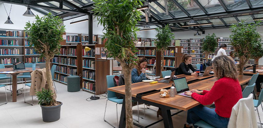 Following a complete renovation, the combined Student Life and Learning Commons opened in March 2019. It offers over 3,500 square meters dedicated to learning, teaching, study, research, student initiatives and campus life. The two buildings are connected at ground level, allowing students to move freely between the learning side and the student-life side of the complex. Between the two buildings sits an elegant reading room, named in honor of President Celeste M. Schenck, with a glass roof providing natural light and a view onto a luxuriant vertical garden. The garden was made possible thanks to the generosity of the classes of the 1970s.