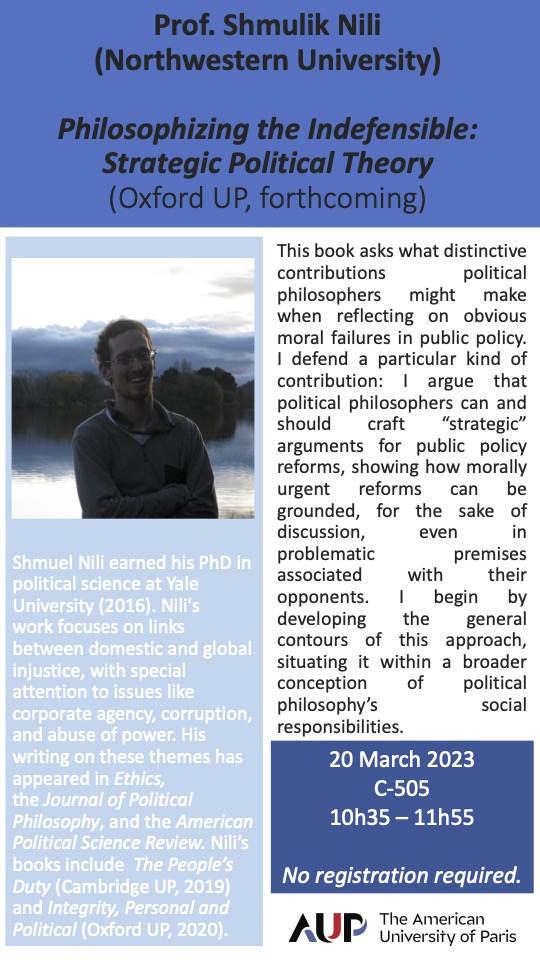Shmuel Nili earned his PhD in political science at Yale University (2016). Nili's work focuses on links between domestic and global injustice, with special attention to issues like corporate agency, corruption, and abuse of power. His writing on these themes has appeared in Ethics, the Journal of Political Philosophy, and the American Political Science Review. Nili’s books include The People’s Duty (Cambridge UP, 2019) and Integrity, Personal and Political (Oxford UP, 2020).