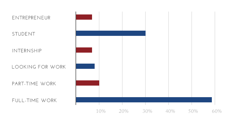 An AUP education can – and does – take our undergraduate alumni almost anywhere. The last three graduating classes alone are living and working in over 50 countries worldwide. These alumni have launched international careers or are pursuing graduate study at some of the most renowned universities on the planet. We hear from our alumni about their career progress in our three-year alumni surveys. The data below represents a 45% response rate to AUP's Spring 2016 "Next Destinations" survey from the graduating classes of 2013, 2014 and 2015.